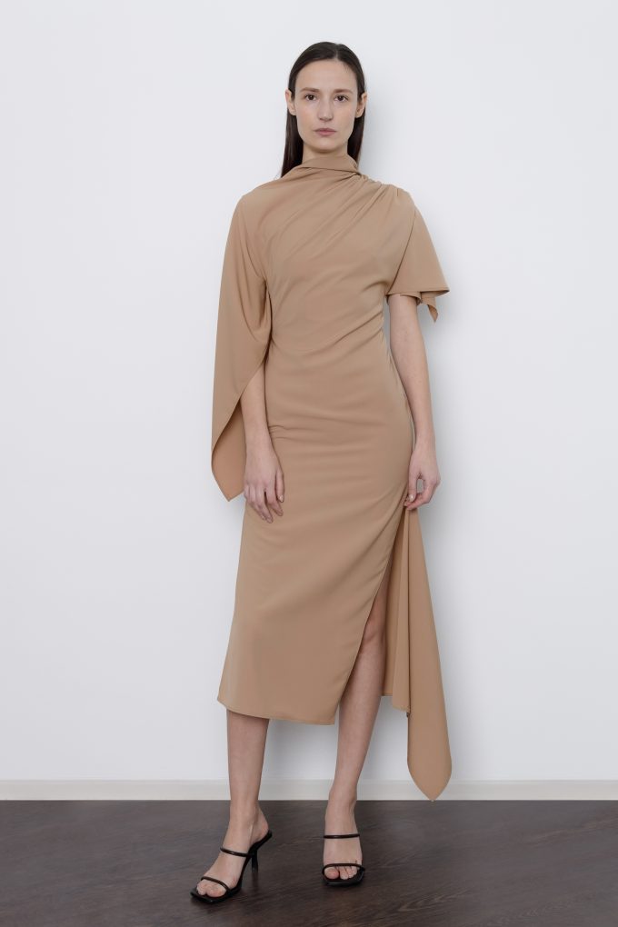 The embodiment of brand’s typical understated elegance, hourglass shaped dress with high draped neckline, beautifully outlined waist and gored skirt with rich geometric hemline.